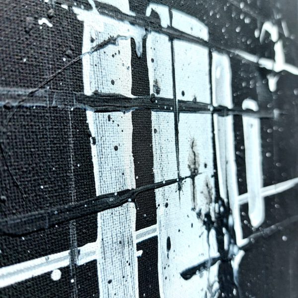 Das Werk ‚Fünf‘ ist in schwarz und weiß ausgeführt. Zentriert befinden sich die fünf Formen und bilden den Hauptcharakter. Verwendung der Spachteltechnik. Acryl auf Leinwand. Rand bemalt.