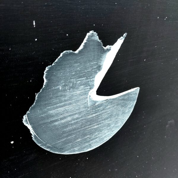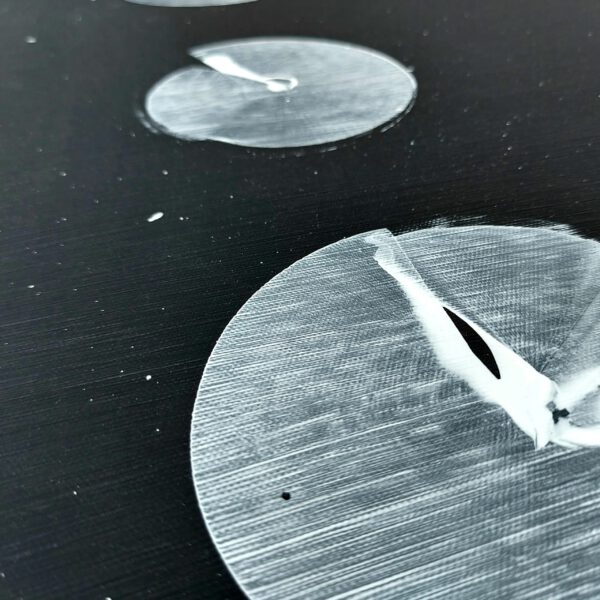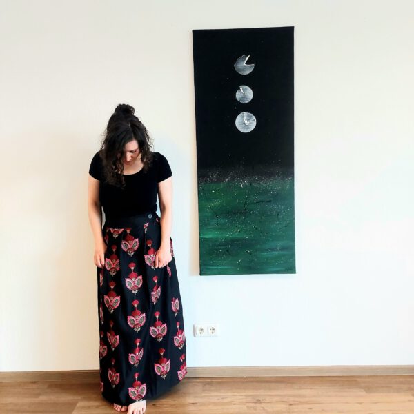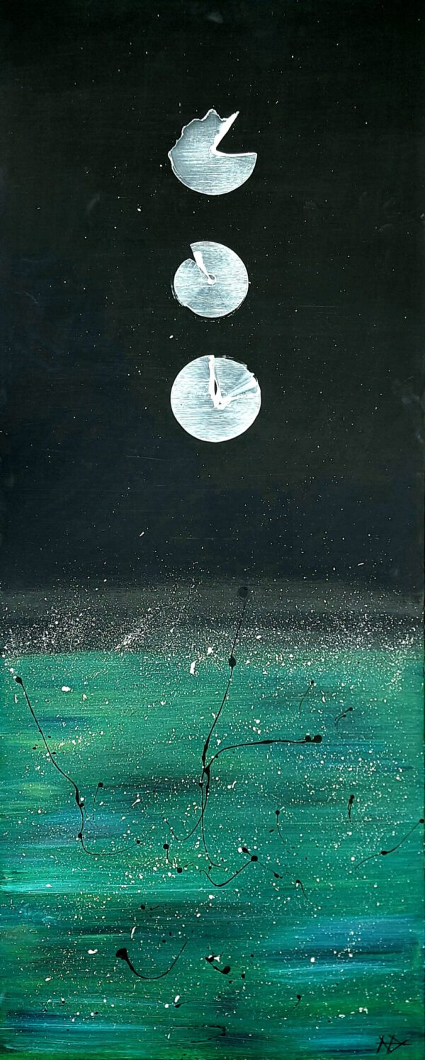 Das Werk ‚Monden‘ verbildlicht fantasievoll die Thematik der Gezeiten. Die Verwendung metallischen Silbers erzeugt Beweglichkeit. Verwendung der Spachteltechnik. Acryl auf Leinwand. Rand bemalt.